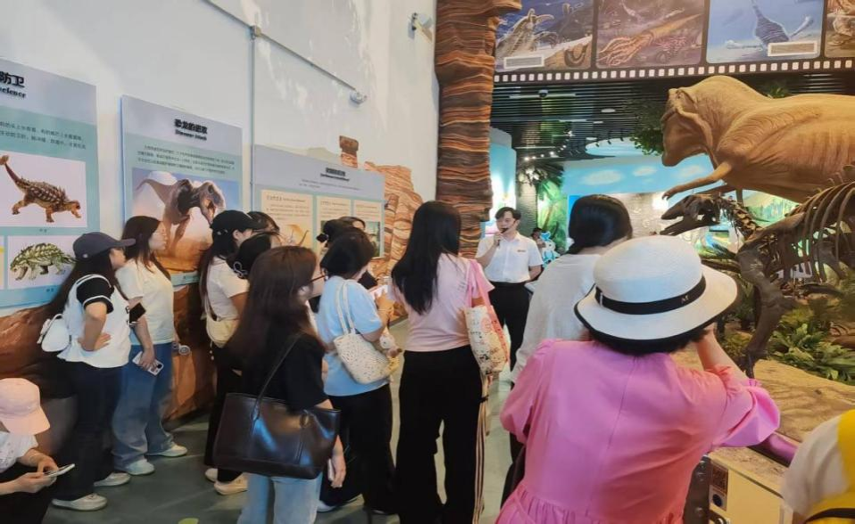 当日,博物馆指导老师带领同学们依次参观各个展区。在地质演化展区,远古生物化石的陈列布局与喀斯特地貌模型的空间叙事,让大家直观感受到展陈设计如何以“静态镜头”讲述广西大地的变迁故事;生态多样展区内,多媒体互动展项与自然标本的有机结合,充分展现了科学内容艺术化转译的创作逻辑;随后,以广西地质科考为蓝本还原的科考场景,展现科学事实如何通过情节构建、人物塑造实现“戏剧化”表达,为戏文专业学生提供了全新视角。同学们还结合专业知识,就科学故事影视化过程中如何平衡真实性与艺术感染力展开探讨,积累科普影视、科学戏剧创作的跨学科经验。