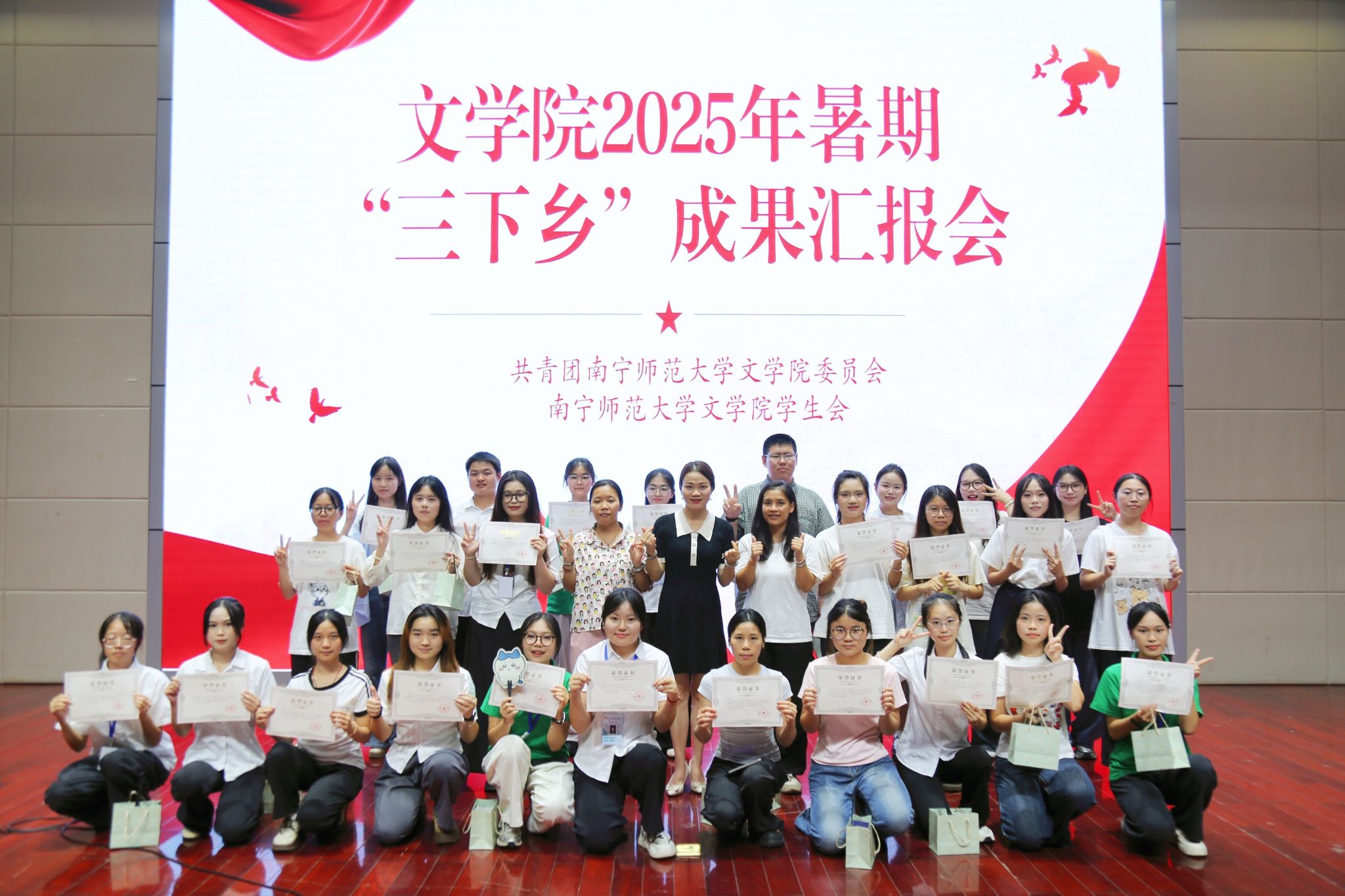 为弘扬大学生志愿服务精神,必赢3003no1线路检测中心在9月17日于文综114报告厅举办主题为“壮韵悠扬传薪火,矢志笃行铸华章”的暑期“三下乡”成果汇报会。必赢3003no1线路检测中心团委书记钟振花,辅导员罗茜、韦肖莹、周泉锶,必赢3003no1线路检测中心青协,二级学院实践部代表、社团代表及2025级新生参加此次汇报会。