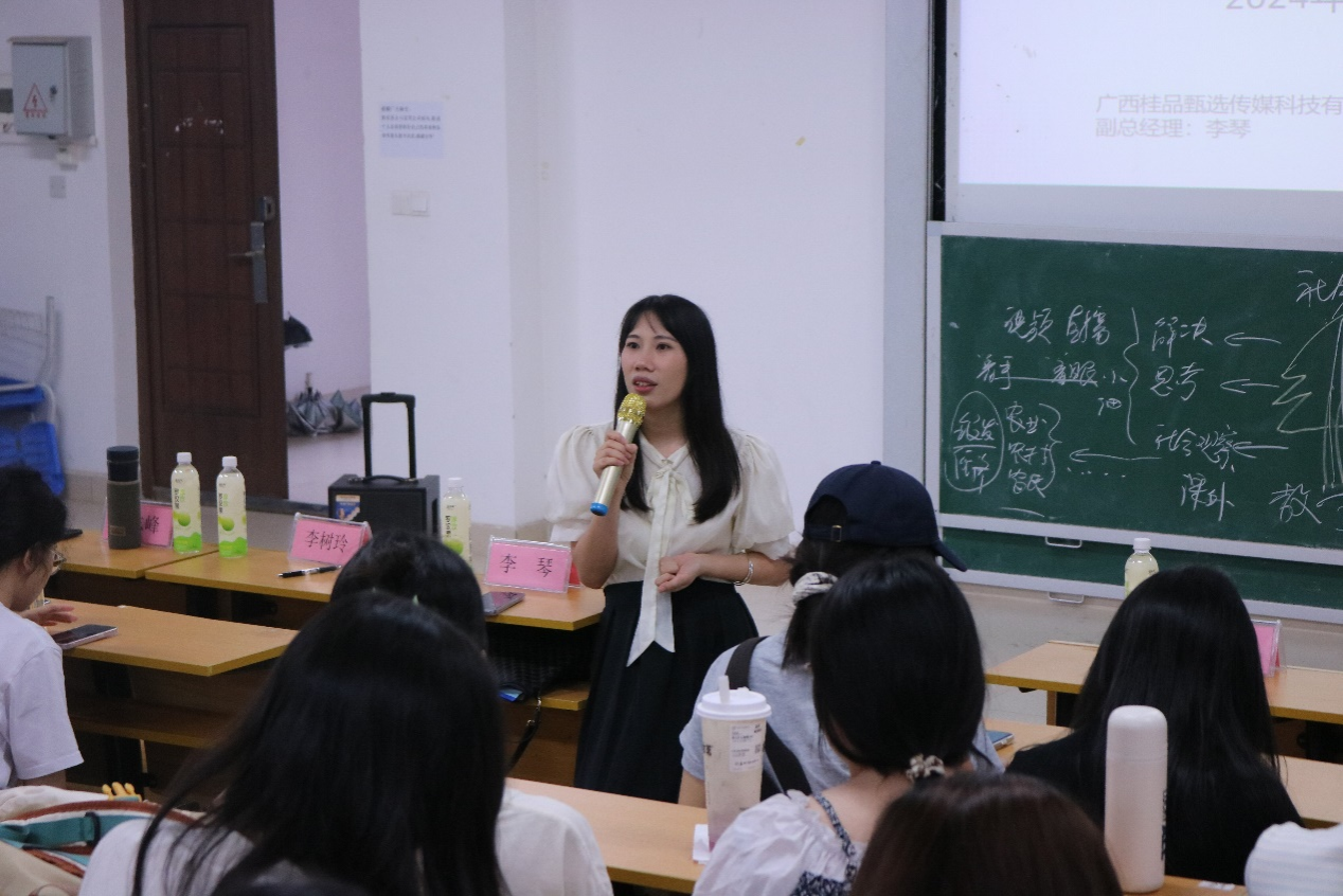 宣讲会上,李琴经理详细解读了桂品文创梦工场的编导、摄像、剪辑、主播、运营、文案及设计七大岗位的职责和要求,还介绍了桂品文创梦工场团队建设过程和成员培训计划,鼓励同学们积极参与,逐梦文创。李志峰老师强调了思辨能力的重要性,鼓励同学们广泛阅读,通过阅读提升自身的思辨能力,并要求我们重视个人素质的提升。互动环节,观众们针对宣讲内容提出了诸多问题,嘉宾们给予了耐心的解答。