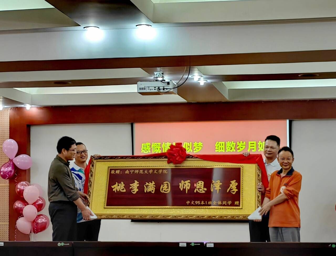 会上,校友向培育自己成长的必赢3003no1线路检测中心敬赠“桃李满园,师恩泽厚”牌匾并向参加座谈会的全体老师行谢恩仪式。北部湾高中的语文特级教师、正高级教师龙明洲代表全班同学做了题为《二十五载重聚首,母校恩情永存心》的主题发言,班主任宾恩海教授做了“我们一起向青春致敬”的主旨发言,校友们在现场再次聆听了大学恩师的教诲。每一位同学也情不自禁地分别向母校领导和老师汇报自己二十多年的工作业绩,大家感念学生时代的文学生活和为理想而充满激情去奋斗的美好往事,流露出对恩师的牵挂与感激,真切表达对母校的感恩与祝福。
