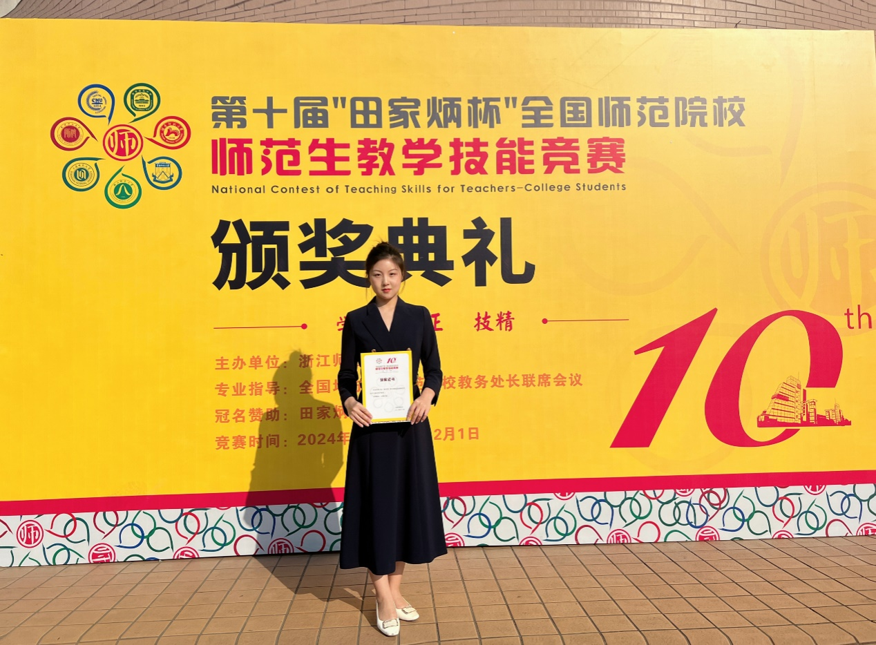 喜讯如风,佳音频至。2024年11月29日至12月1日,第十届“田家炳杯”全国师范院校师范生教学技能竞赛决赛在浙江师范大学举行。本届竞赛共有来自全国250所院校的1831名选手参加,参赛院校数与选手数量均创历史之最。经过初赛评审,155所院校的509名选手参加现场决赛,最终角逐产生一等奖176名、二等奖333名,其中汉语言文学组共135名选手参与初赛,50名选手入围决赛,决出一等奖17名、二等奖33名。我院赵珂裕同学在指导老师黄铮、黄斌、王毅的悉心指导下,认真备赛,从容应战,经过初赛严格选拔,成功入围决赛,并在决赛中凭借出色表现荣获一等奖的好成绩。