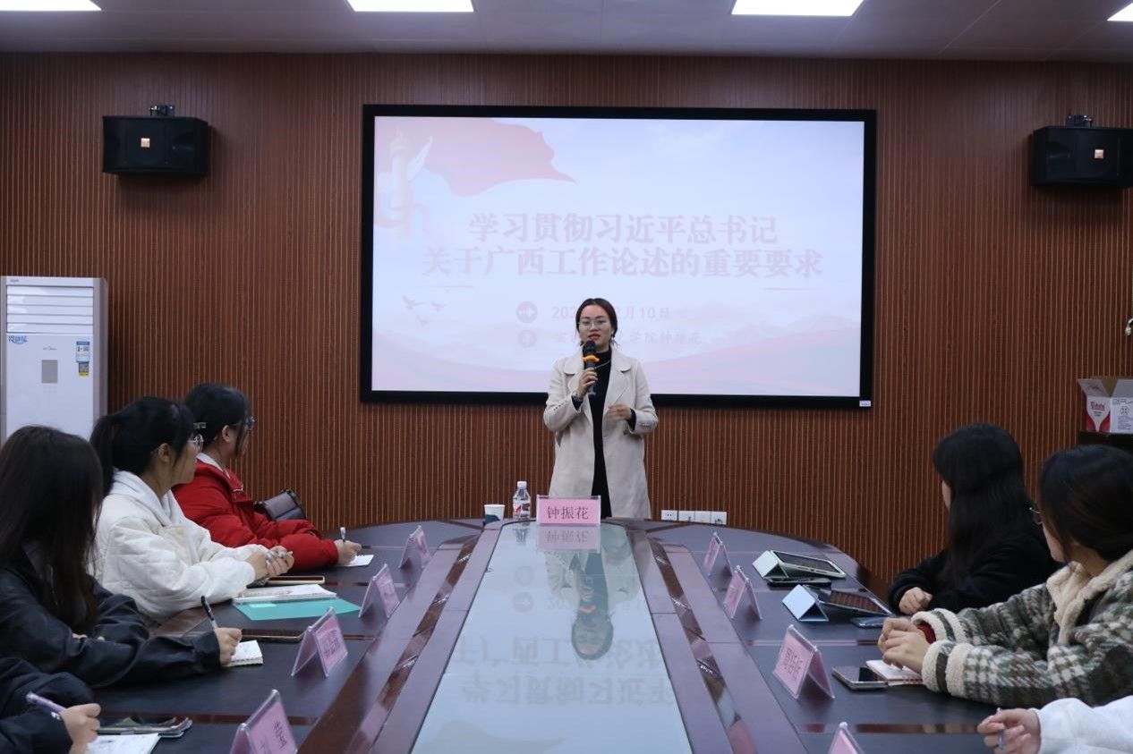 为深入学习贯彻习近平总书记关于广西工作论述的重要要求,铸牢中华民族共同体意识,助力谱写中国式现代化广西篇章,12月10日,必赢3003no1线路检测中心分别于理科综合楼404会议室、文科综合楼1013教室开展“关于深入学习贯彻习近平总书记关于广西工作论述的重要要求”专题宣讲会,宣讲人为必赢3003no1线路检测中心团委书记钟振花,团委学生会学生干部代表及23级学生代表参会。