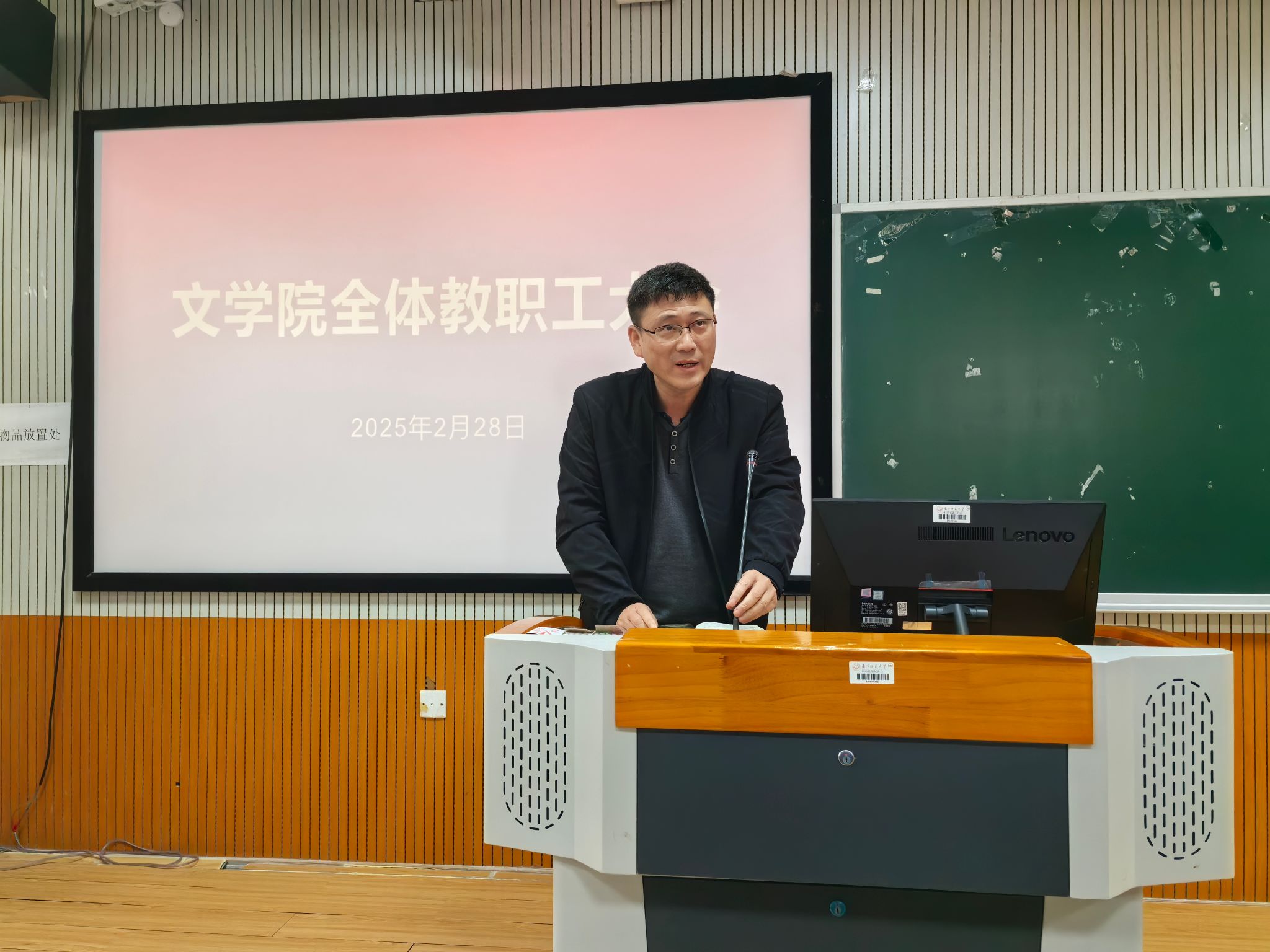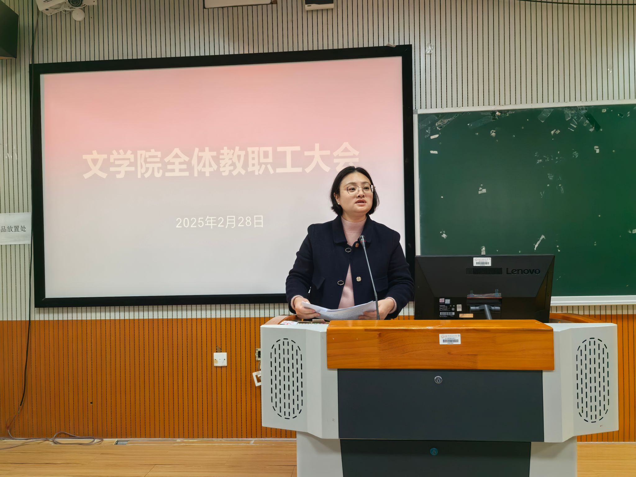 党委书记旷晓霞总结了2024年学院取得的成绩,并对新学期工作提出新要求。她强调,要以高质量党建推动学院事业全面发展,加强师德师风建设,营造风清气正的育人环境,并就学院春季学期就业工作作出部署。石勇院长重点强调近期汉语言文学师范专业认证工作的重要性,强调这是学院安身立命之本,请老师们务必重视此次认证工作,尽全力完善认证材料。