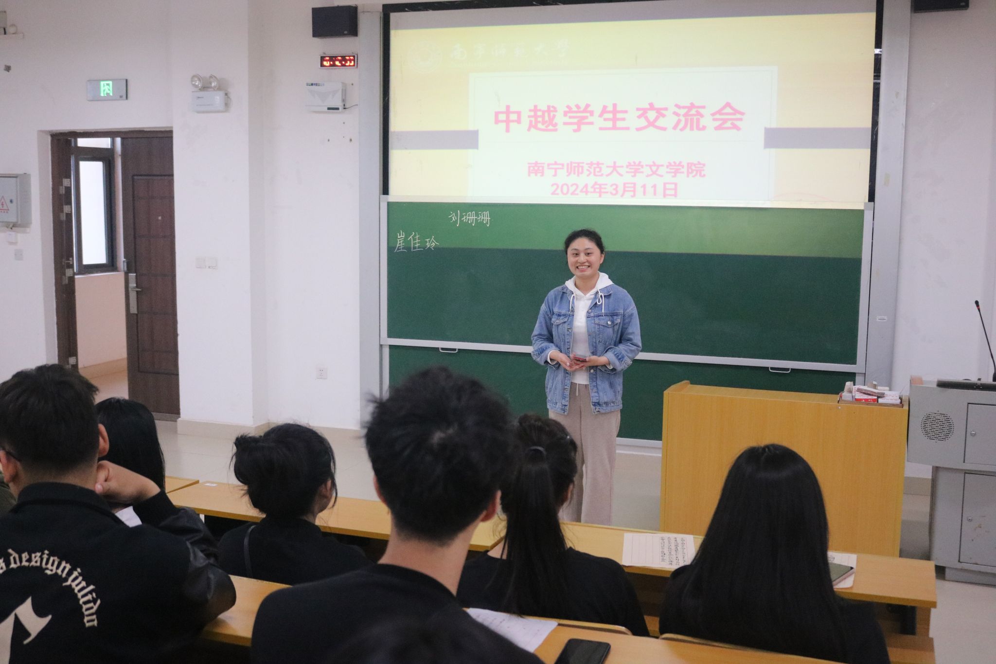 交流会上,必赢3003no1线路检测中心学生干部崖佳玲向越南朋友介绍了学院大致情况,举办的系列活动、经典比赛等,为大家播放了由必赢3003no1线路检测中心承办的校级课本剧大赛中的《秋瑾》片段,并表示后续的各种活动热烈欢迎越南同学们的参与。同学们一一介绍自己的基本情况、家乡美食、兴趣爱好等,带动越南部分同学也参与自我介绍的队伍中。中越学生在一阵阵欢声笑语中互相认识,现场交流互动进展顺利,气氛和谐融洽。