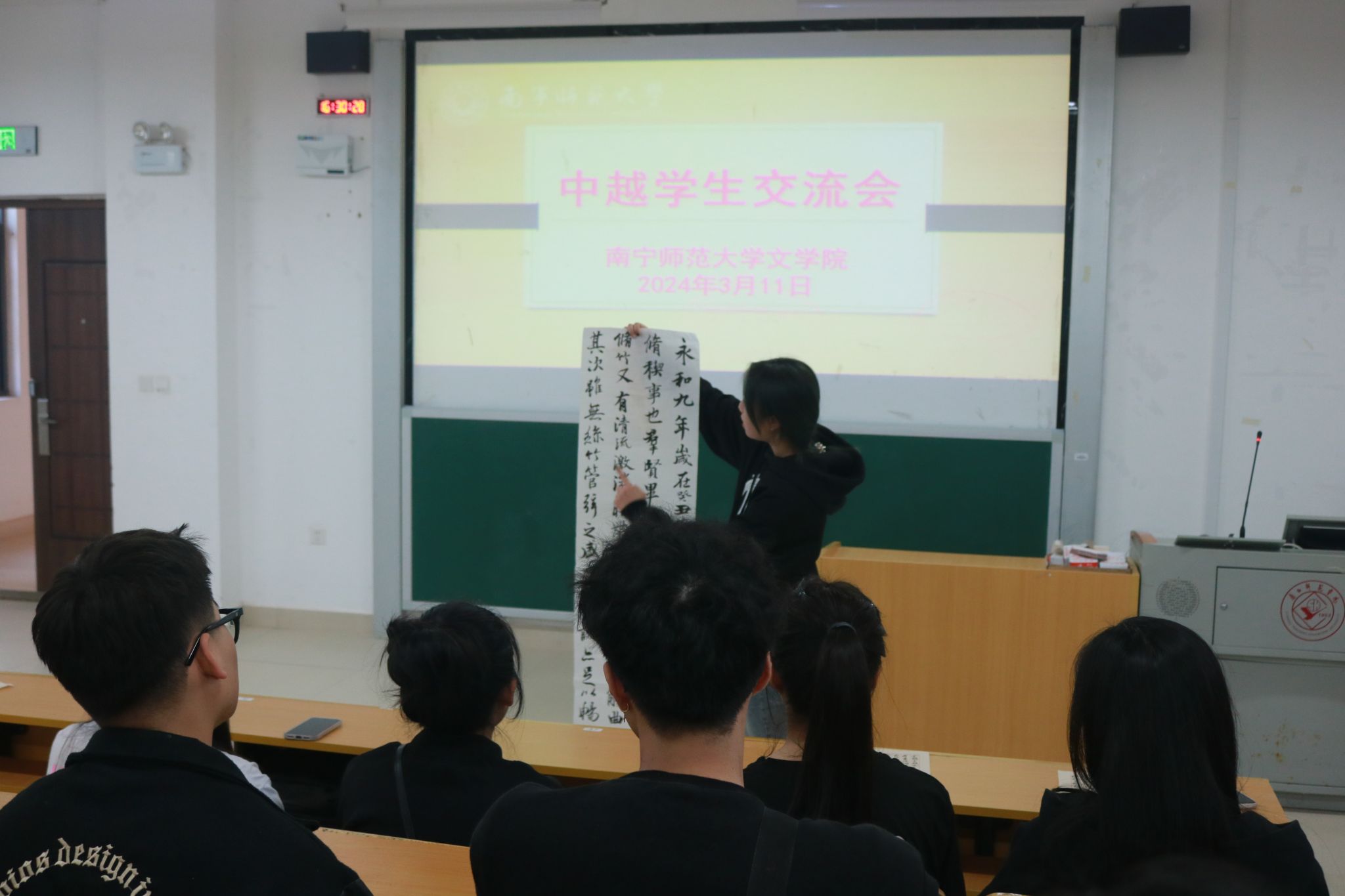 此外,必赢3003no1线路检测中心学生在交流会现场向越南朋友发放由学院学生书写的毛笔字,胡语同学介绍了中国书法遵循从右往左写的规律,以其中一篇书法作品《赤壁赋》讲解了中国古代文人墨客的潇洒与自由,同时也向大家展示了中华汉字的独特魅力。