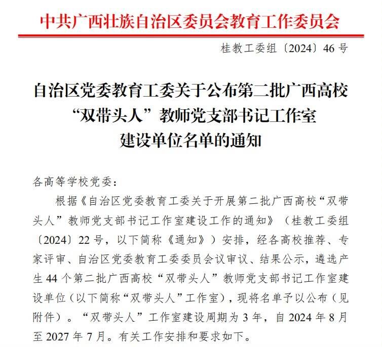 近日,自治区党委教育工委公布了第二批广西高校“双带头人”教师党支部书记工作室建设单位名单,必赢3003no1线路检测中心教工第一党支部书记工作室荣列其中。