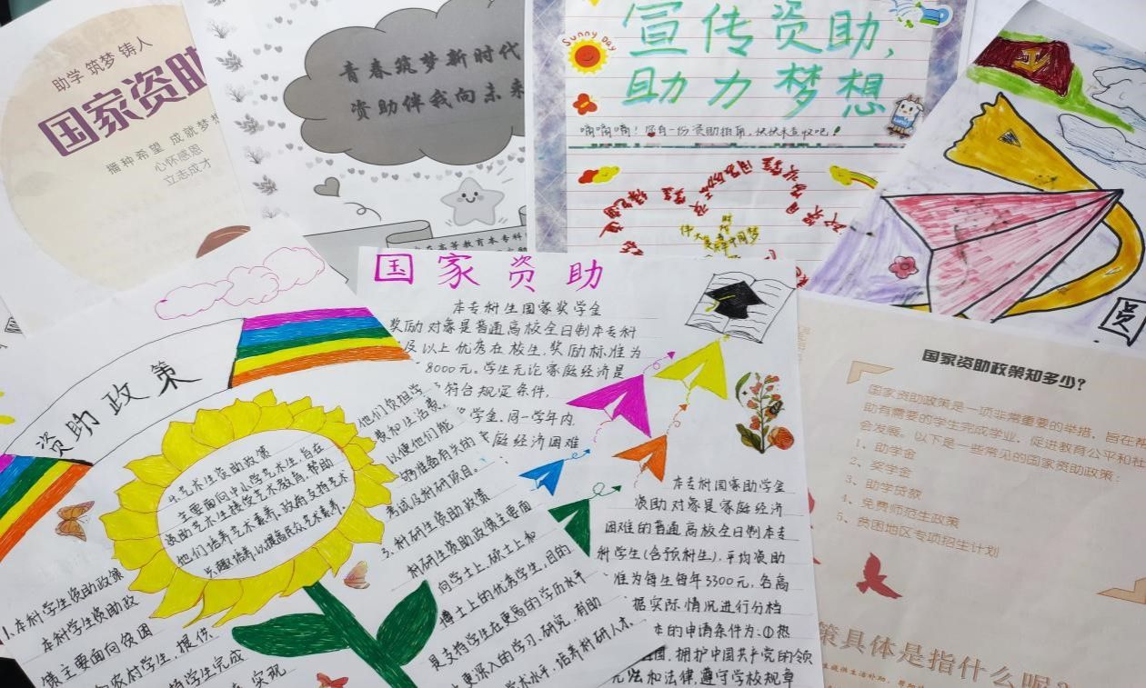 参赛同学以绘画、文字等形式,将国家资助政策通过一份份精美的手抄报、海报传递给大家。每一份佳作构思精巧、内容丰富多彩,多角度地宣传了与国家资助政策的知识,充分体现了知识性、趣味性与实用性的统一。22汉本三班杨运言同学的作品以国家资助为题,从“助学、筑梦、铸人”三个角度入手,制作了图文并茂的宣传手册;23汉本四班胡兰芳同学的作品采用手绘、贴纸等形式以温暖、可爱的画风将作品呈现出来。经过评委老师公正的评分,杨运言、胡兰芳、苏晓琴同学荣获一等奖,吴美霞、李俊良、梁莹莹同学荣获二等奖,彭铭琪、肖小月、江雨芯荣获三等奖。